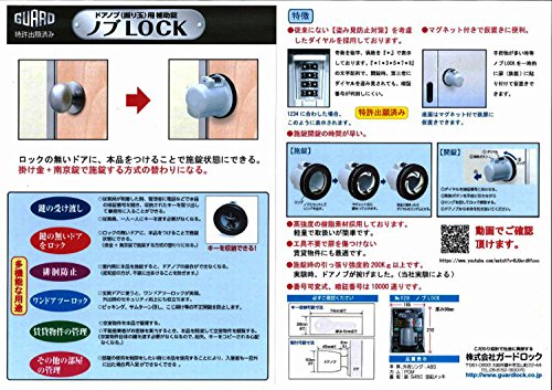 こちらはドアノブに被せるだけで簡単に設置可能な簡易式補助錠です。ドアノブに被せるだけで二重ロックになります。またダイヤル式なのでキーの紛失の心配がありません。古い賃貸物件などでは玄関がこのタイプのドアも有ると思いますが、このノブLOCKなら工事不要で設置出来るのでセキュリティ強化におすすめです。また玄関以外にも鍵が付いていないドアノブなどにも取り付ける事が出来るので非常に幅広く使うことができます。別の使い方で補助錠の内部にキーを収納する事も出来るので、ドアキーの共有などにも活用できます。