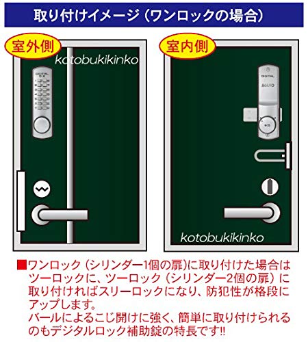 こちらは外付けのテンキーで暗証番号を入力するタイプの補助錠になります。今まで紹介させて頂いた補助錠は比較的取り付けが簡単な簡易タイプを紹介させて頂きましたがこちらは取り付けに工事が必要なタイプになります。簡易設置タイプの補助錠は取り付けは簡単ですが構造上外側から施錠してしまうと室内側から鍵を開けられなくなってしまう物も多数あります。こちらの補助錠は扉の内側にサムターンがあるので簡易設置タイプの補助錠で考えられる閉じ込め事故などの心配がありません。また簡易タイプと比べ頑丈な作りになっています。戸建ての玄関ドアなどにおすすめの補助錠です。