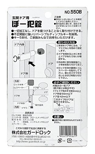 こちらの補助錠は特別な工具などは必要なく、取り付けが非常に簡単な簡易タイプの補助錠になります。こちらの補助錠の特長は外付けする錠の部分が在宅、留守に関わらず付いたままになります。外から見たときに補助錠で在宅、留守の見分けが付かないので防犯効果がアップします。また補助錠本体をドアから取り外す必要が無いので錠本体の紛失などの心配もありません。穴あけ加工なども必要が無いので賃貸住宅にお住いの方などにもおすすめになります。