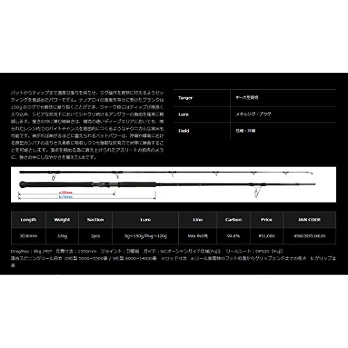 メタルジグ120g、プラグ80gまで対応できるロックショアスペック。公式ホームページではメタルジグの80gから100g、プラグの60g前後が扱いやすいセッティング、と紹介されています。極端に深い、潮が速いポイントでなければこのクラスで十分!PE4号まで対応可能なセッティングで、大型回遊時期に合わせる強めの構成にも対応できます!