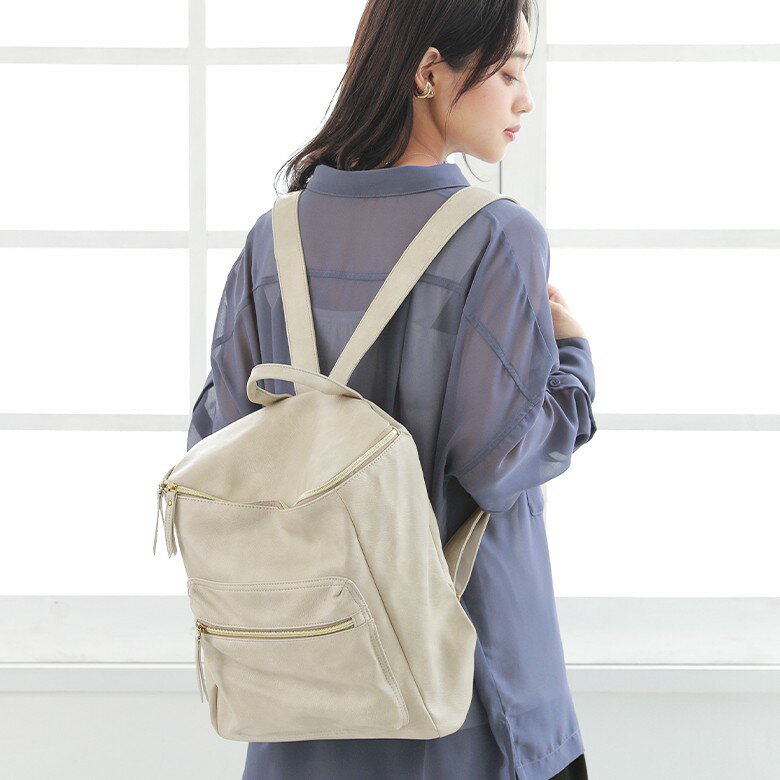 全体的にワントーンでシンプルなデザインですが、フロントのレザーパッチに施されたブランドロゴやメタルスタッズがポイントとなり、おしゃれで上質さを演出しています。都会的なきれいめスタイルや、通勤、ちょっとした外出時の服装にも合わせやすい大人女子に人気のリュックサックです。