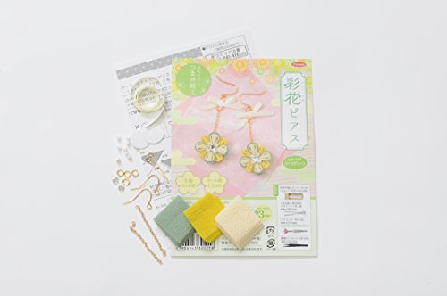 パナミのつまみ細工 ピアスキットにはカット済みちりめん生地、ラインストーン、パールビーズ、ピアス金具、チェーン、9ピン、丸カン、リボン、ボール紙台紙がセットになっています。