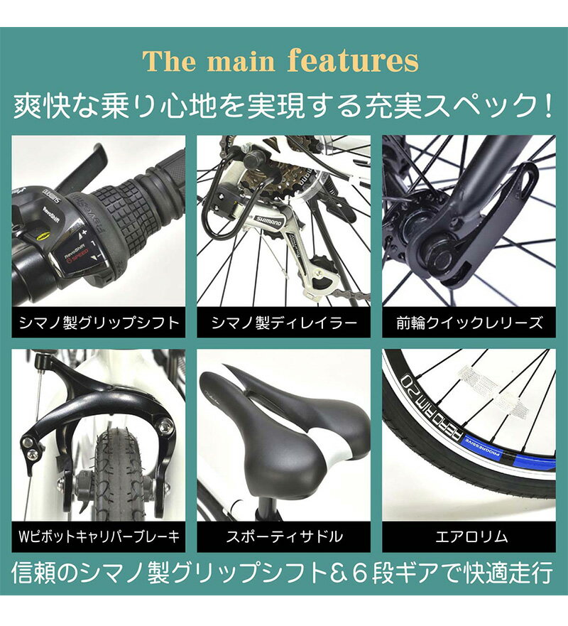 おしゃれで飽きのこない、シンプルなデザインも魅力的なクロスバイクです。信頼のメーカー"SHIMANO"の6段変速ギアも装備されていて、グリップを握りながらでも、簡単にギアチェンジを行えるグリップシフターも装備されており、脚力の弱い自転車初心者の方も、上り坂でもスイスイと、軽い乗り心地で前進していくことができます。