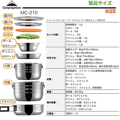 いろいろなキャンピング用品をリリースしているキャンピングムーン社のクッカーセットです。写真でも分かるように多点数のセットですので、使用状況の選び方としてはファミリーキャンプです。他メーカーのファミリーキャンプ用クッカーと比較しても多点数ですが、他メーカーのセットでは省かれている物もセットに入っています。自宅の台所感覚でキャンプ場を利用できるでしょう。