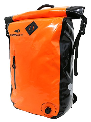 アマゾンに棲む巨大魚「ピラルクー」から名付けられたブランドで防水等級の表示はありませんが、水を通さない素材でできている防水袋です。バックタイプなので大きく25Lにもなりますが、旧来のモデルより5cm浅くなっていて使いやすくなっています。水を中に通さない素材というのは空気も通さないものが多く防水袋を閉じたときに膨らみやすいのですが、下部に付いているバルブを開くと余分な空気を抜き無駄な膨らみを抑えられます。
