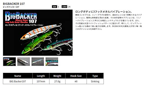 コノシロをはじめとする、大型ベイト系のパターンに効くバイブレーションです。108mm33gの幅広ボディで、水中での存在感をアップ。ボートや河口のシーバス、サーフ堤防の青物、ヒラメと幅広い釣りで活躍します。重さ、引き抵抗ともビッグなので、タックルは強めがおすすめ、シルエットサイズが欲しい時に活躍してくれます!