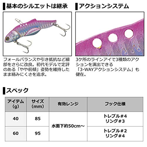 シーバス向け鉄板バイブのド定番!実績抜群のロングセラーアイテムです。重さは13g、18g、26gの3種類で、水深や流れの強さに応じて選べる構成。沖堤防でのデイゲームが特に強いアイテムですが、サーフゲームや青物ゲームでも活躍できます。高速巻きに強いボディ設計で、リアクション狙いに最適!価格は少し高めですが、必ずチェックしておきたいアイテムです!
