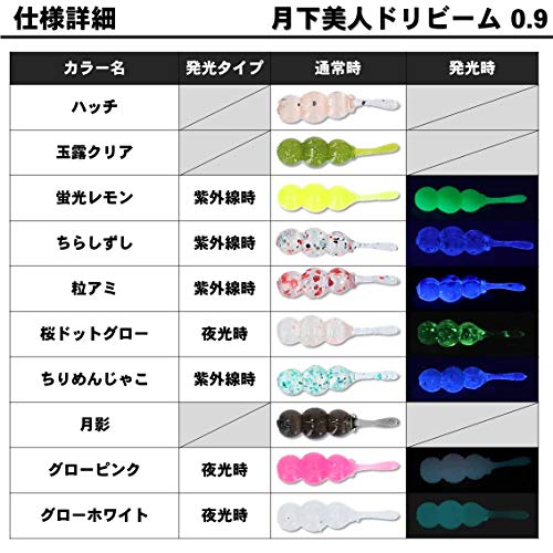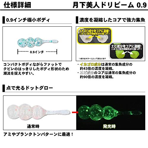 記事中でも何度かご紹介した、ダイワのマイクロベイト対応アジングワームです。ショートながらファットな仕上げで、操作性やフォールスピードを確保。エビ粉コア、イカゴロコアとにおいでも誘えるセッティングになっています。専用設計とも言える「月下美人SW ライトジグヘッド SS極み」との相性は抜群!プランクトンパターンのアジングは、「ドリビーム0.9」で攻略しましょう!