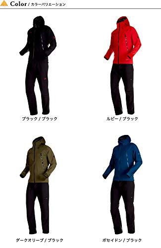 登山・アウトドア用を前提に製作されているレインスーツですので、登山中にあると便利な機能を多数搭載しています。ゴアテックス3層ガイドバッカ―を採用しており、表面・中間・裏面それぞれにゴアテックス加工して、防水・透湿を完璧にこなせる雨具・カッパです。アジャスターコードなどで微調整も可能な工夫など多数あり、サイズはXLからSまで5サイズ、カラーは3色でズボンは黒で統一されています。