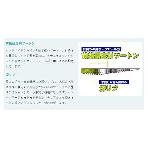 アジング、メバリングどちらにもおすすめ!フィッシュラボ人気の万能型ピンテールワームです。バスワームを思わせる深いリブが特徴のアイテムで、サイズ以上に水を掴む抵抗の大きさがポイント。スローフォール、スローリトリーブといった基本的なアクションをサポートしてくれます。前方と後方で硬さや色が違うので、ハンドポワードらしさを体感したい方にもピッタリ!スタンダードなサイズで、小型狙いの釣りも遊びやすそうです!