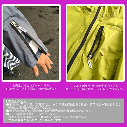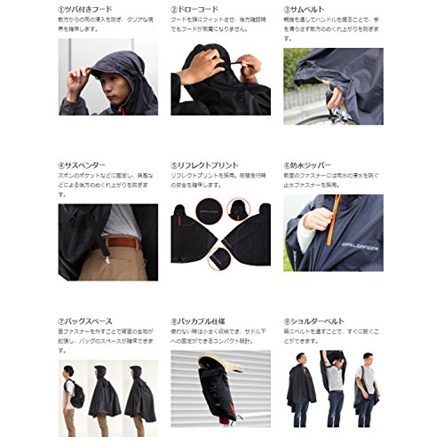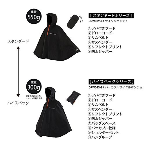 デイパック等を背負って着用しても問題ないようにデザインされている他、雨の日の走行を快適にするための防水の工夫が多数されています。もちろん一般の雨具使用でも問題ありません。素材は210TナイロンにPUコーティングしています。そのため300gの軽量に仕上がっています。この製品はハイスペックモデルですが、スタンダードモデルと比べるとコスパ的に安い製品です。男性向けとして販売しています。