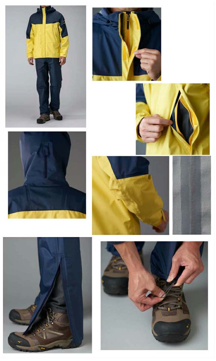 またジャケットの裾部分は、スピンドルゴムのアジャスター仕様で、フィット感を向上させることも可能です。パンツのフロント部分には、前開き樹脂ファスナーを採用し、水の侵入を防ぐために三角マチを付けています。また擦れやすいヒップ部は、二重生地で補強してあります。