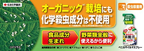 薬品を使わないことに拘っていると、元の野菜がダメになると思い、こちらの商品を買いました。 結果は、大満足です。 一回このスプレーをかけただけでアブラムシは、即死。 一週間以上たった今でも、アブラムシ、他の虫、一切見ません。