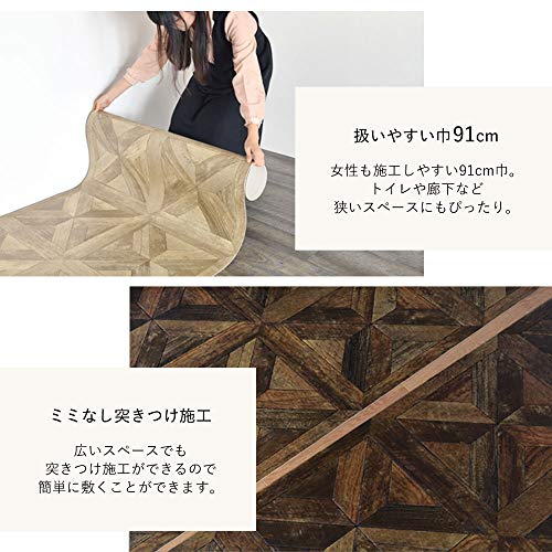 サイズは厚み1.8mmの幅は短めの91cm。販売は1m単位の量り売り。端の耳がなく4模様でちょうど91cm四方の正方形になります。畳を組み合わせて敷くような感覚で使えるのが少し面白いクッションフロア。カラーは明るめのナチュラルオークと赤みのある暗い色合いのダークオークの2色。
