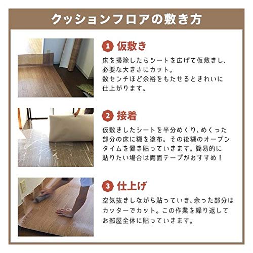 気に入った柄や厚みのクッションフロア材を用意しましょう。土足用と書いてあるものは厚手でクッション性も良く防音効果も高くおすすめです。ただし安い方が良いという方はもっと薄くてコストがかからないものでも、お部屋の雰囲気を変えるだけなら十分なことも。目的とお財布に相談してお好みの柄を選びましょう。