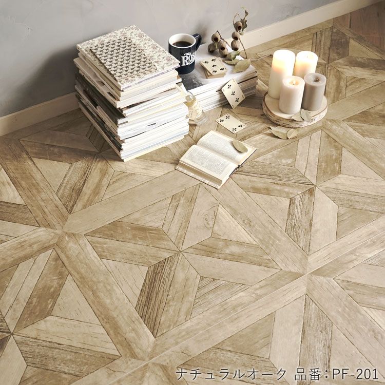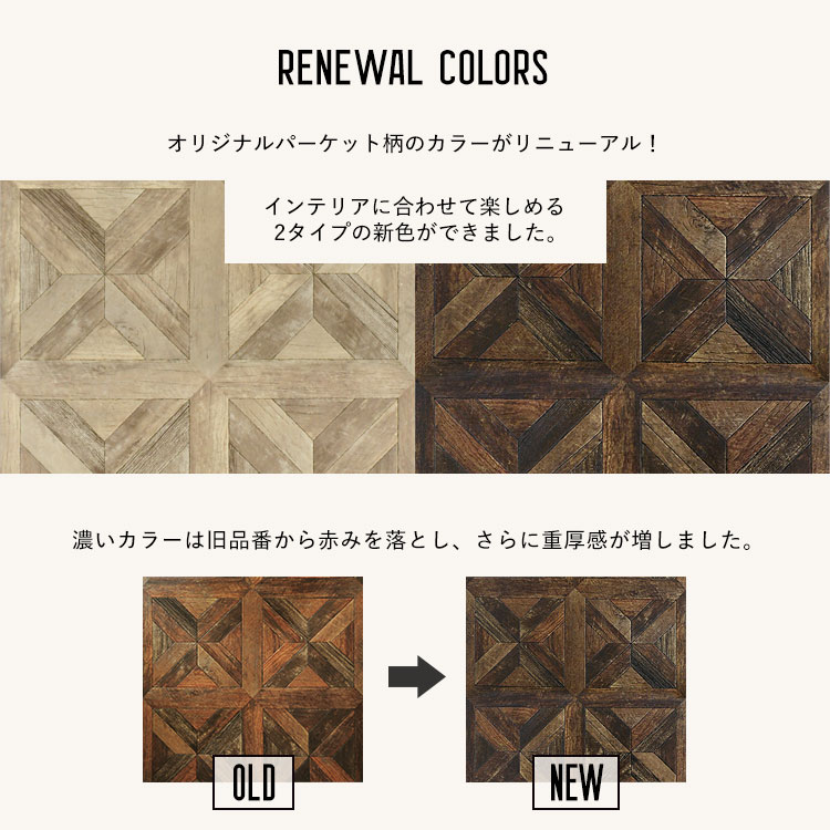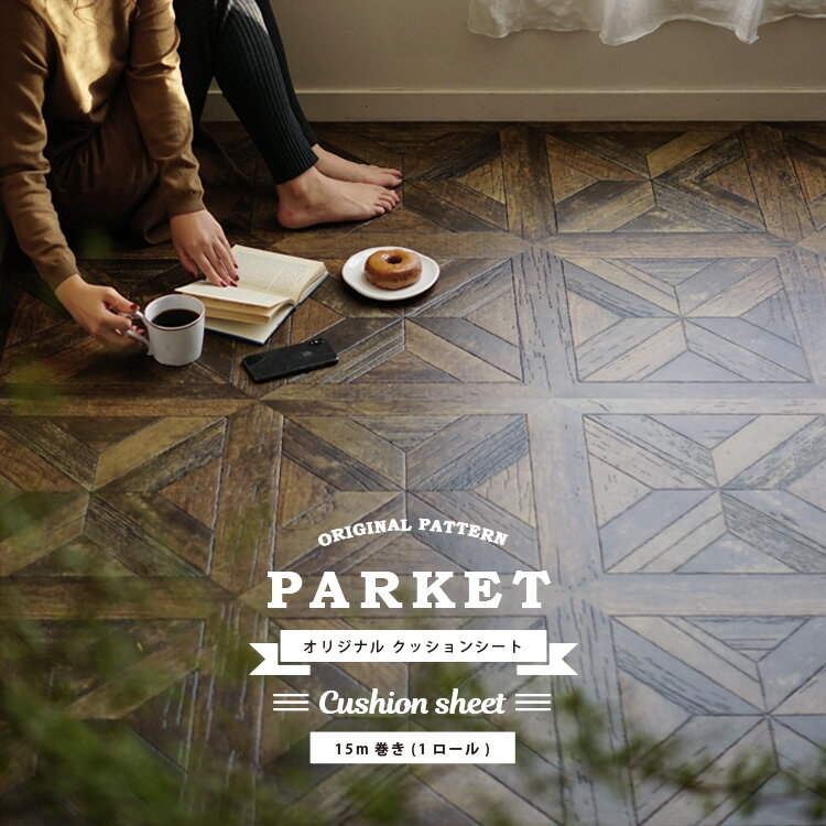 正方形の模様が連続してある柄のことをパーケットといいます。タイルのような感覚で切り貼りして使えるので、敷設する場所によっては一般的なフローリングシートよりも無駄になる用尺が少なくお得になることがあるんですよ。