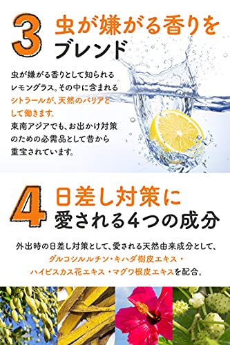 こちらの日焼け止めスプレーには、6種類のアロマエキスを配合しており、ひと吹きでUV効果と虫よけ効果を発揮します。肌に優しい成分で作られているほか、石鹸で落とせるというのも魅力ポイントの1つ。