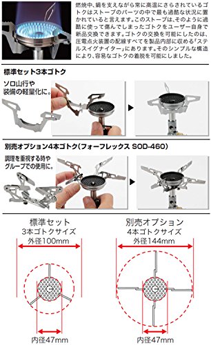 縁部分が高くせり上がっているすり鉢形状のバーナーヘッド構造を採用していて、風に煽られた場合でも燃焼効率が衰えにくく、火力を落とさずにクッカーで調理することができるシングルバーナーです。五徳の着脱は工具不要で簡単に行えますので、女性にも扱いやすいです。