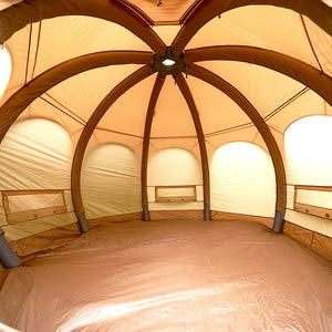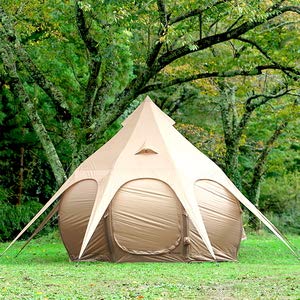 蓮型テントNAGASAWA300は、キャンプ場でも映える蓮型の個性的なデザインで、ドーム型に近い広い空間になっています。大人4~5人でゆったりと就寝できます。軽量のポリエステル素材になっていて、取り扱いも楽にできます。
