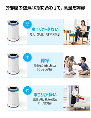 MOOKA 空気清浄機には、モードが3パターンあります。弱はホコリが少ないとき、中は宙に舞ったホコリの除去、強は一気にホコリを吸い込みたいときに最適。