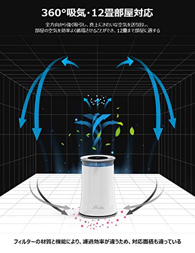 MOOKA 空気清浄機は小さいサイズの中でも大きめな空気清浄機で、最大12畳の範囲まで対応してます。360度から空気を取り入れるので、短時間で空気の除去が可能です。