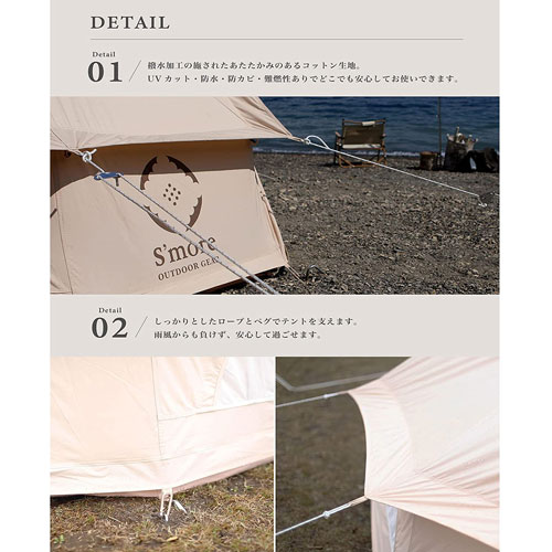 キャンプがどういったものかを体験できる、グランピング施設によくあるベルテントで、ワンポール式で組み立ての非常に簡単な点も魅力です。またそばに薪ストーブを焚いていても安心な、難燃性に優れるコットン生地の人気テントになります。夏は涼しく冬は暖かく過ごせるテントなので、一年を通して活躍します。