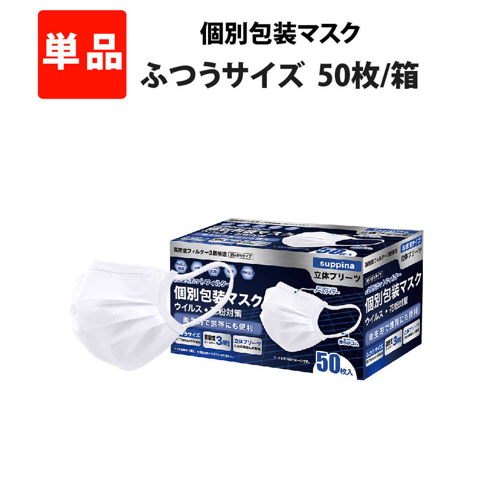 suppina 白マスクは、マスクが1つ1つ個別で包装されています。そのため、常に清潔な状態のマスクを利用したいという人におすすめ。シンプルなホワイトカラーなので、どのようなシチュエーションにも対応します。