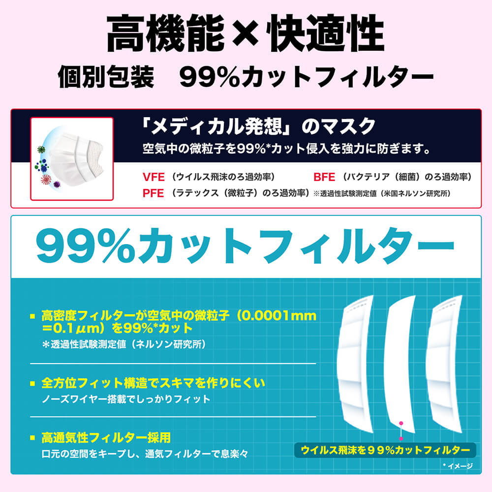 また、個別包装は持ち運びやすいのもポイントです。高密度フィルターを採用することで、ウイルスの侵入を防いでいます。