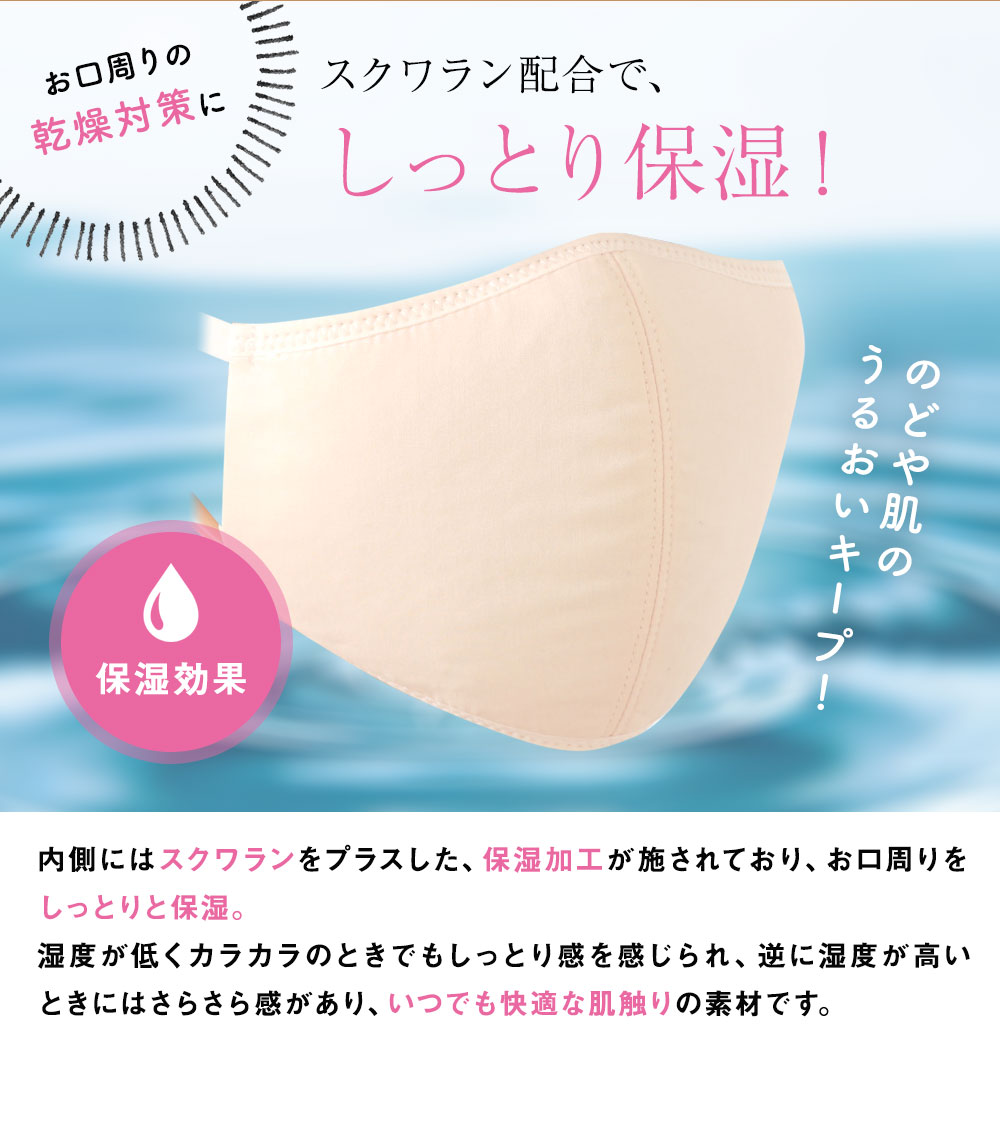 こちらのマスクは、のどを乾燥から守る潤い成分を搭載。ふんわりとした素材で作られているため、肌や耳が痛くなりづらいです。