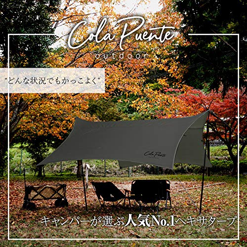 ColaPuente(コラプエンテ) タープは、珍しいブラックカラーが採用されています。タープの多くはナチュラルな風合いのものが多いですが、こちらはかっこよくて、シックな印象を与えるのがポイント。