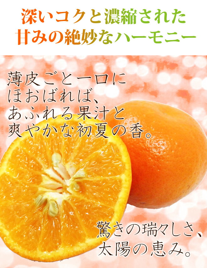 見た目は温州みかんと似ていますが、みかんよりも果皮の色が赤みがかった橙色をしています。甘み、酸味ともしっかりとした濃厚な味わいで後味はスッキリとしています。果肉が柔らかく果汁が豊富なので、手で剥くと果汁があふれ出し手を濡らしてしまうことがあります。ジョウノウと呼ばれる薄皮は非常に薄く、気にせずに一緒に食べられます。独特な香りも特徴で、皮を剥くとさわやかな香りがふわっと周りに広がります。