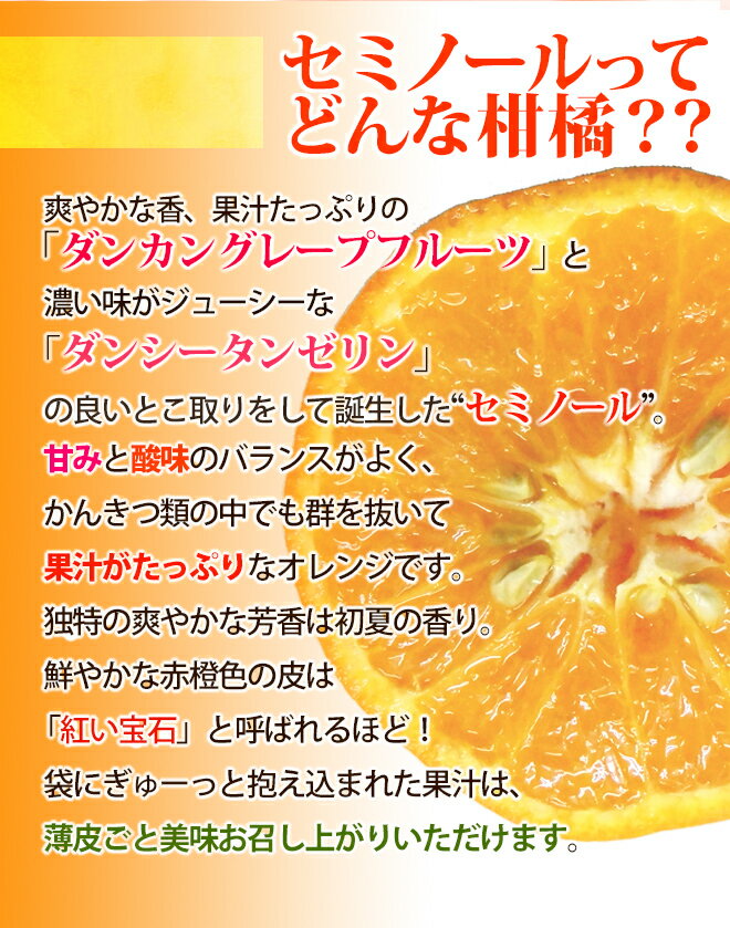 セミノールはみかんの種類の中でも高級で贈答品としても喜ばれます。収穫時期が難しく、剥き方が面倒で他の柑橘類と比べて日持ちしないというデメリットはありますが、豊富な栄養分や濃厚な味と香りはとても魅力的です。また、みかんがあまり見られない春から初夏の季節が食べごろという点も柑橘類好きには嬉しいです。まだ食べたことのない方は是非一度食べてみて、その濃厚な果汁と独特な香りを堪能してください。
