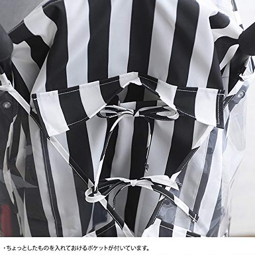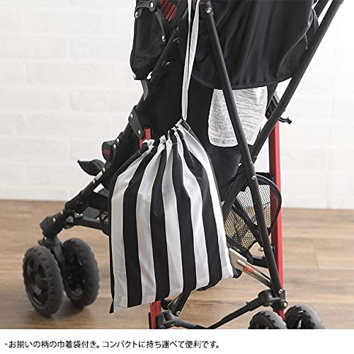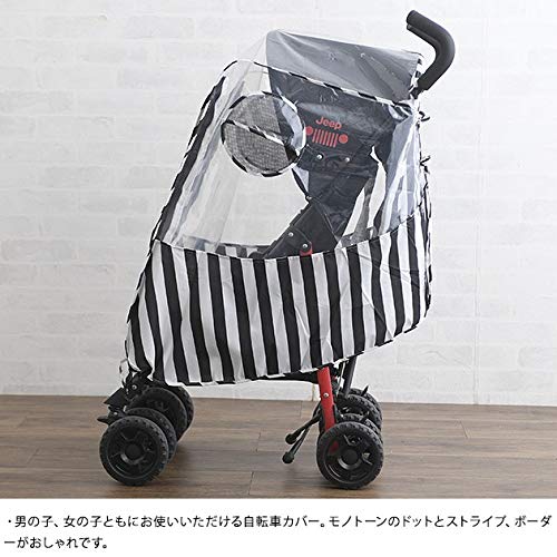 性別を問わず装着できるデザインのレインカバーがこちらです。モノトーンなのでスタイリッシュなママやパパのファッションとも合わせやすく、お出かけがウキウキしてきます。前面は透明なので視界が広く、両サイドの穴のおかげでレインカバー内のムレを防止してくれます。同じ柄の巾着袋もついているので、天気が怪しい日のお出かけの際に持ち運ぶのもかんたんです。