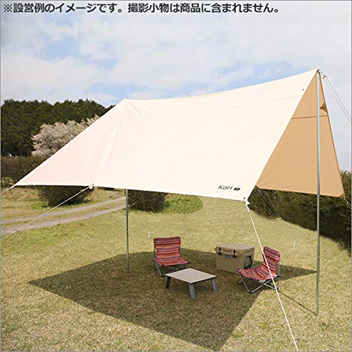 タープのサイズは300 x 400cmで、キャンプのリビングスペースやレジャーにぴったりのサイズです。耐水圧は350㎜で、急な雨もしっかりと防ぎます。オフホワイトのナチュラルなカラーで、おしゃれでとても映えるタープです。