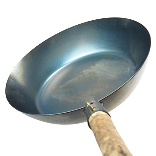 青みががかった色合いに惹かれます。 出荷時にシ-ズニングが済んでいる手間の要らないフライパンです。 このフライパンは現地で枝を見つけて柄に使うのが特徴ですが、コンロ用の短い柄と薪スト-ブ用の少し長い柄の2本をホムセンで売ってるφ24mm丸棒で作りました。