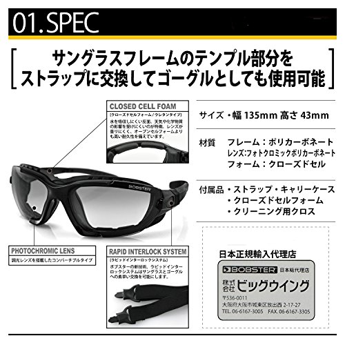 レンズは調光レンズを採用し、いちいち天候に合わせてレンズを変える必要がなく、自動で明るさを調整してくれる便利な保護メガネです。テンプル部分を付属のストラップに変えれば、フィット感が更に増すとともに、走行中に間違って落とすこともありません。