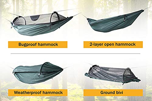 寝心地抜群のハンモックテント11つ目はDDハンモックの「スーパーライトジャングルハンモック」です。DDハンモックが持つ技術をつぎ込んで作られた超ハイスペックなハンモックテントで快適な寝心地からテント空間まで最高に過ごしやすいテント生活を提供してくれるアイテムとなっています。このモデルの蚊帳は取り外し可能で防水シートになっているのでテントの上や下に付けることもできます。また、蚊帳部分にはポールを入れることで自立するので木がない場所でも地面において簡易テントしても設営可能です。