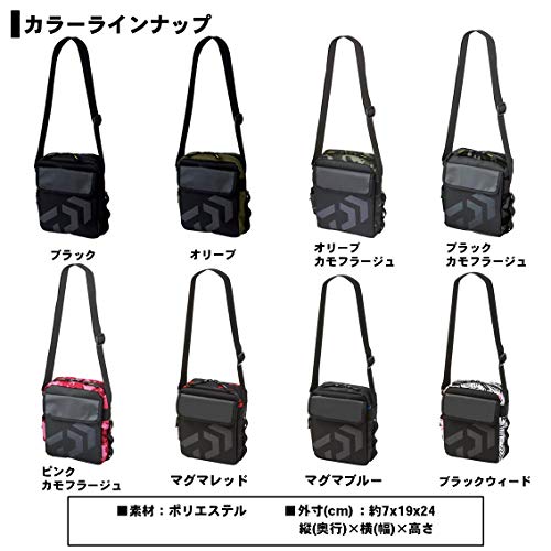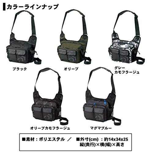 こちらもカラーが追加された、ダイワの釣りバッグです。ヒップバッグほど圧迫感がなく、ショルダーバッグよりも容量を確保できるというのがメッセンジャータイプの特徴で、作業台的な使用感よりもとにかく容量、という場合はこのタイプのバッグがおすすめ。機能も内側ペットボトルホルダー、ウエアホールドサイドロープと容量重視の構成です。側面の形状が変わりやすく、ロッドホルダー系とはあまり相性がよくありませんが、ガッツリ入れるならこのバッグです!