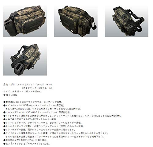 カラーはブラックとカモの2パターン。ご紹介している「ランガン ライトショルダーバック」だけでなく、ワンサイズ大きな「ランガン ショルダーバック」も用意されています。容量はVS3010で言うと2つ対6つというサイズ感なので、お持ちになる釣り具をイメージしながら選んでみてください。タイトル通り、ライトな釣りには「ランガン ライトショルダーバック」、大きめのハードルアー、ワームも4インチクラスをたくさん、という場合は「ランガン ショルダーバック」をおすすめします!