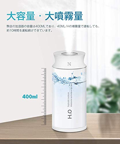 【2020進化版】加湿器 超音波 超静音 次亜塩素酸水対応 400ML 大容量 卓上加湿器 3つ強度LED照明 タイマー OFF 噴霧量40ML/H 空気清浄機 空焚き防止 部屋 車載 オフィス 乾燥/花粉症対策 400ML (ホワイト)