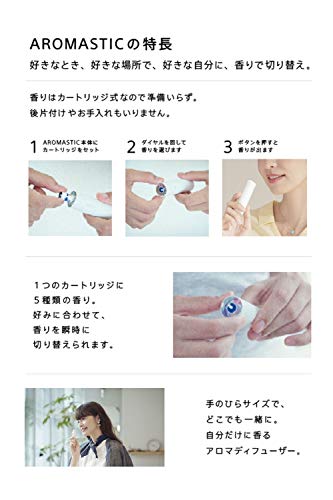 AROMASTICは仕事中や外出先でも携帯して、気分を変えたい時にすぐにアロマリフレッシュができます。専用のカートリッジは、1つのカートリッジに5週類の香りが含まれていて、簡単に香りを切り替えて楽しむ事ができます。新しくハワイの香りやパリの香り・文学の香り等のカートリッジも販売されています。
