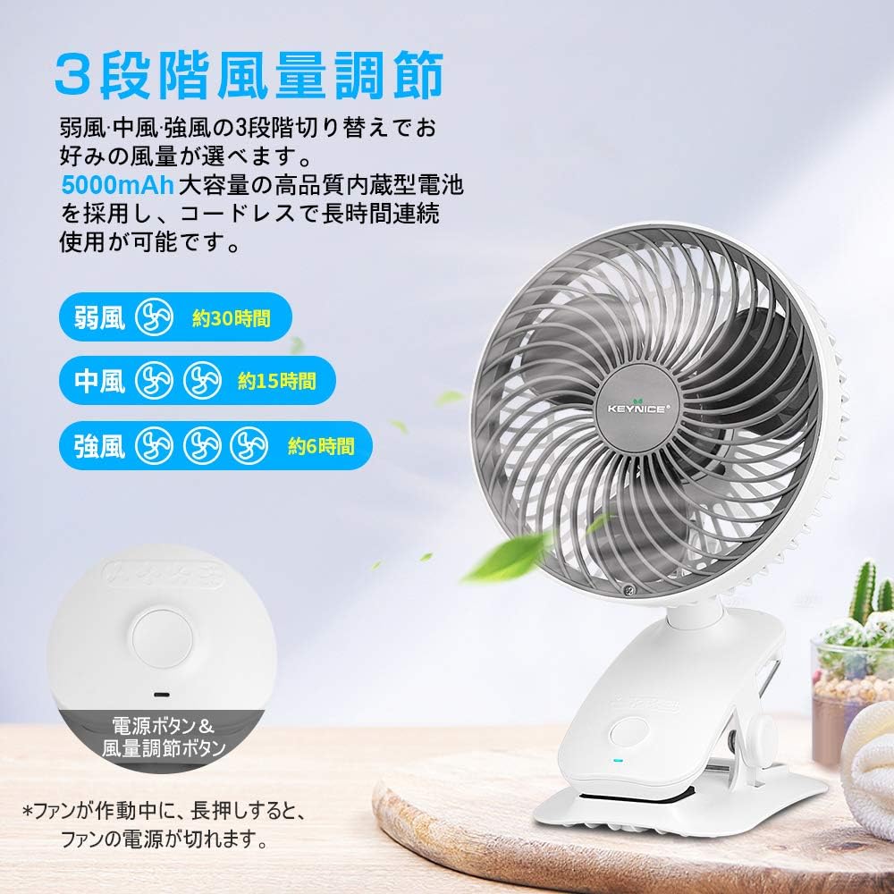 KEYNICEのクリップ式扇風機は、約500g程度と軽量なので、持ち運びもしやすいです。モバイルバッテリーやノートPCにUSBケーブルをつなぎ給電できます。見た目もおしゃれで、機能的ながらお値段もお手頃なので人気の高い小型扇風機です。