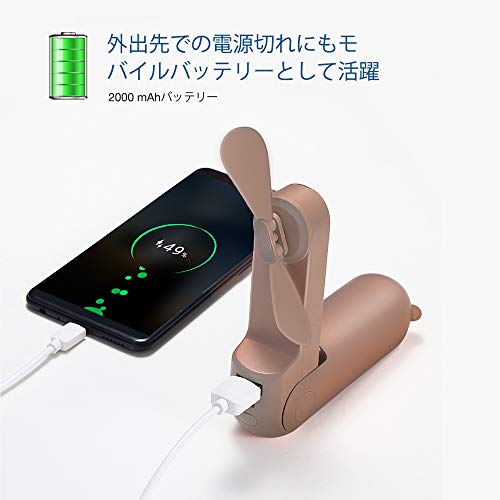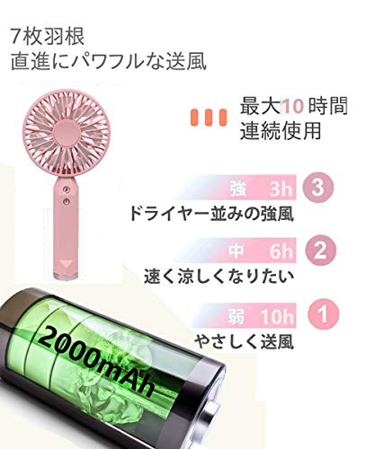 14-22時間動作充電式手持ち扇風機,2000ⅿAh モバイルバッテリ, 懐中電灯,パワフル、コードレス、小型、ミニ、コンパクト,風量2段階調節, 超静音,USB充電式 折りたたみスタンド機能