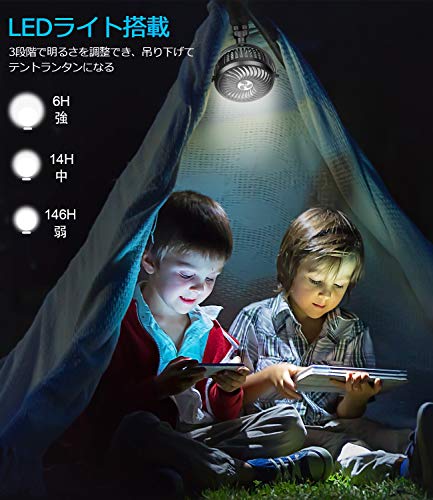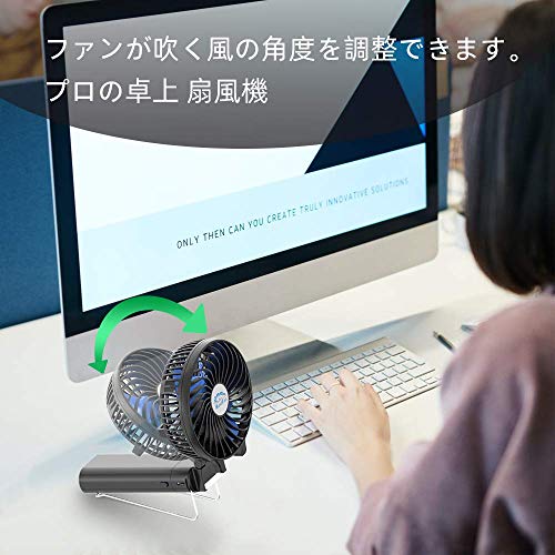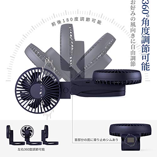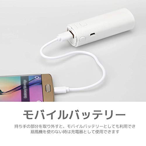 3段階の風量調節ができファンの角度を自由に変えられます。6枚羽設計で最強の風力があり、猛暑の時期に活躍します。ハンドル部分は分離でき、大容量のモバイルバッテリーとしてスマートフォン等に使用できます。扇風機は折りたたみができて金属のブランケットが付いているので、車の車内に取り付けて使用できます。リュックの肩紐に取り付けて持ち運びもできます。