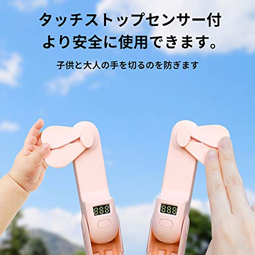 2枚羽のファンは良質のゴムでできていて、指で止められるタッチストップセンサーが付いています。子供の手に触れても安全な設計になっています。折りたたむと卓上でも使えてUSB充電ができます。携帯を挟んでゲームをしながら扇風機の涼風を受けることができます。羽を収納するととてもコンパクトで、洋服のポケットに入れて持ち運びができます。