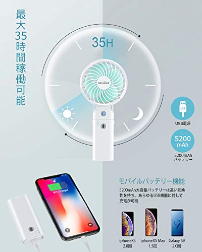 手持ち扇風機 静音 【2020年最強版 20dB超静音】「 5in1機能搭載 」携帯扇風機 URHARBOR 5200mAh モバイルバッテリー内蔵 最大35時間動作 6段階風量調節 手持ち 卓上 クリップ 首掛け 扇風機 モバイルバッテリー ハンディファン 小型扇風機 折り畳み スタンド機能 ホワイト 【一年保証 PSE認証済】