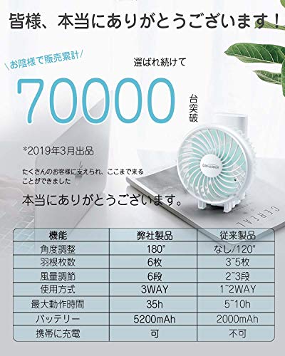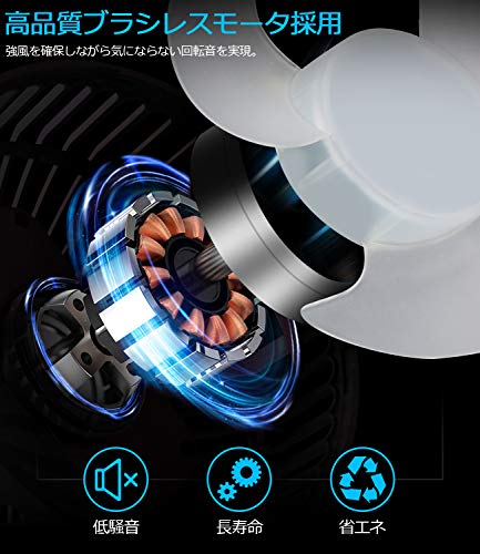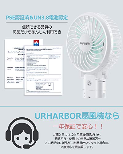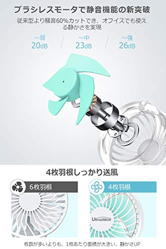 出典: https://www.amazon.co.jp/%E3%80%902020%E5%B9%B4%E6%9C%80%E5%BC%B7%E7%89%88-20dB%E8%B6%85%E9%9D%99%E9%9F%B3%E3%80%91%E3%80%8C-URHARBOR-%E3%83%A2%E3%83%90%E3%82%A4%E3%83%AB%E3%83%90%E3%83%83%E3%83%86%E3%83%AA%E3%83%BC%E5%86%85%E8%94%B5-%E3%83%A2%E3%83%90%E3%82%A4%E3%83%AB%E3%83%90%E3%83%83%E3%83%86%E3%83%AA%E3%83%BC/dp/B0881L2SZC/ref=psdc_14157271_t2_B07R7L8243職場や図書館でも使える超静音タイプで、従来型より60%騒音をカットしています。大容量バッテリーで最大35時間の連続使用ができます。6段階の風量調節と自然風モードがあり、自然風モードは弱風と微風で優しい自然の風を送ります。野外などの暑い所では最強のパワフルな風を送り涼しく快適に過ごせます。付属のクリップを使用するとクリップファンとしても使え、風の角度も自由に変えられてとても便利です。