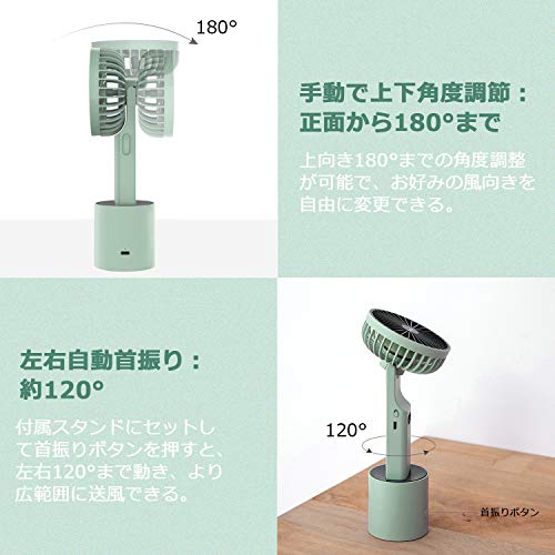 手持ちと卓上両用出来るのは勿論、首振りもします。充電の残量もパーセント表示で分かりやすいです。通勤中は手持ちで使用し、職場のデスクに置いて首振りしてると、コロナ対策にもなるし良いです。充電は、暑い時だけ付けていれば一日持ちます。とても可愛いし、使い勝手が良いです。