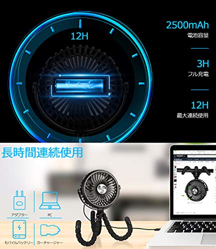 職場や自宅のデスク・車の中で使うのに便利なクリップ機能があり、首の部分の角度も自由に変えられます。カバンのショルダー紐にも取り付けができ、外出時の使用も快適です。USB充電式で充電が長持ちし、最大15時間連続使用ができます。風量を最強にすると野外でもしっかりと風を送ります。