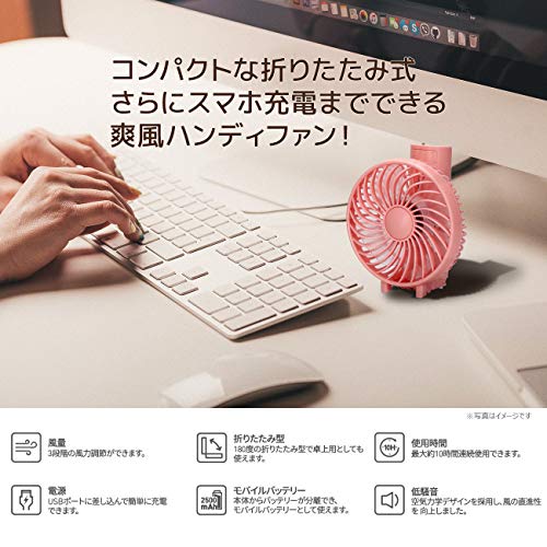 本体もコンパクトで折り畳み式となっており、持ち運びに便利だと思いました!ピンクを頼んだのですが、色味も可愛くて、娘も気に入っており、これから沢山使おうと言っています!充電できて、スマホも置けて、風の強さも二段階で選択できるので、とても良いです!!